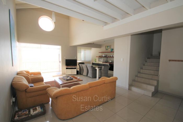 Embrace relaxed beachside living just steps from the sand in a secure complex, with a balcony featuring an outside braai — three bedrooms, two bathrooms and double garage.