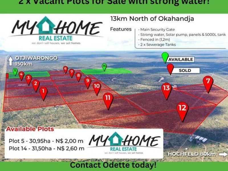 Escape city stress with peaceful rural living 12 km from Okahandja, on a secure 5-hectare fenced plot with roaming kudu and optional water/electric hook-up — ideal family retreat.