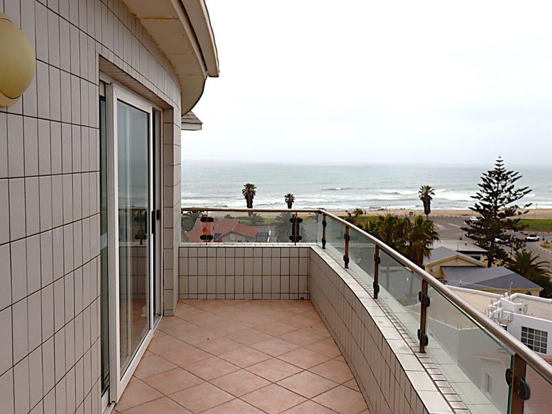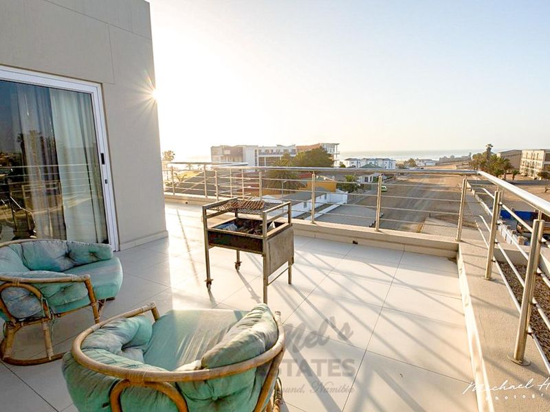 Seaside penthouse living in central Swakopmund with panoramic ocean and town views, private balcony, modern chef's kitchen and fireplace — two en-suite bedrooms, study and four garages.