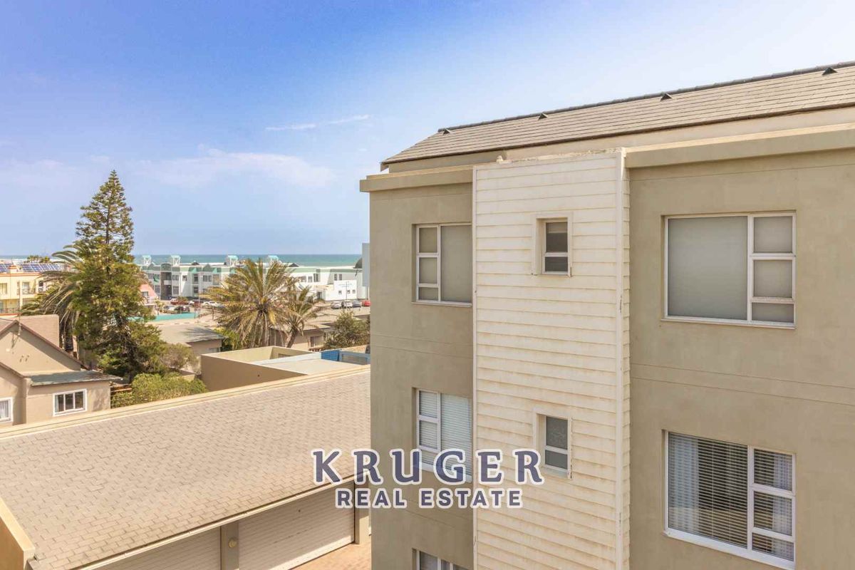 Wake up to ocean breezes seconds from your door in central Swakopmund; open-plan living flows onto a balcony with sea views, two bedrooms, two bathrooms, lift access.
