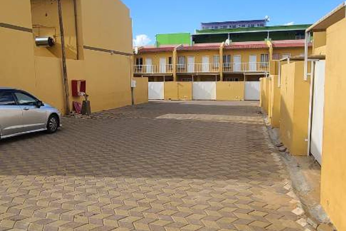 Lock-and-leave duplex near Funky Town Mall and UNAM Khomasdal, offering a paved courtyard and sunny entertainment patio — pet-friendly, two bedrooms, one bathroom, single shaded carport.
