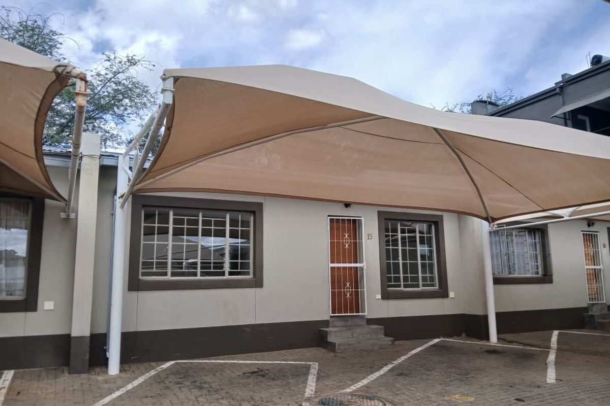 Enjoy relaxed indoor-outdoor living in a quiet, tree-lined neighborhood with an open-plan lounge-kitchen and shaded courtyard barbecue beneath a thorn tree — two bedrooms, one bathroom, plus two shade-net parking bays.