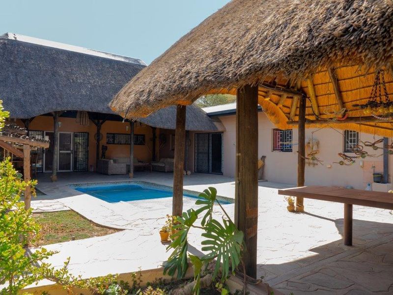 Modern 3-bedroom house in secure Omaruru Wildlife Estate with wildlife, solar energy, water systems, and stunning views of Erongo Mountains.