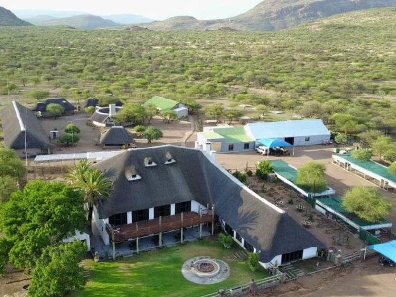 Ideal base for nature lovers between Omaruru and Etosha National Park, offering pool, restaurant and guided game drives — 12 luxurious chalets with private bathrooms, camping on riverbank.