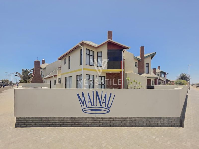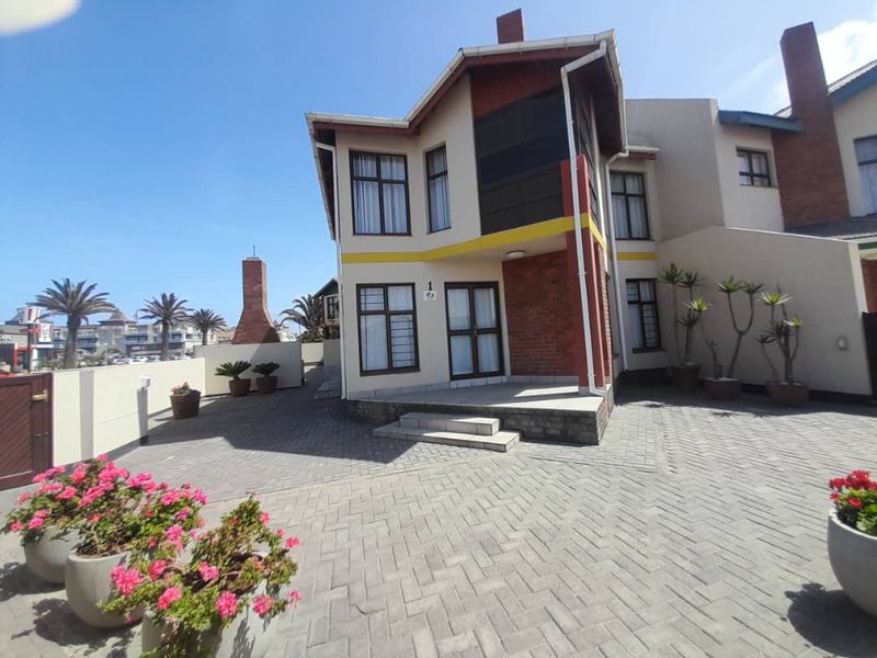 Experience coastal town-centre living in Swakopmund, steps from shops and restaurants; double-storey townhouse with modern kitchen, outdoor braai and cosy indoor fireplace — three beds, three baths, single garage.