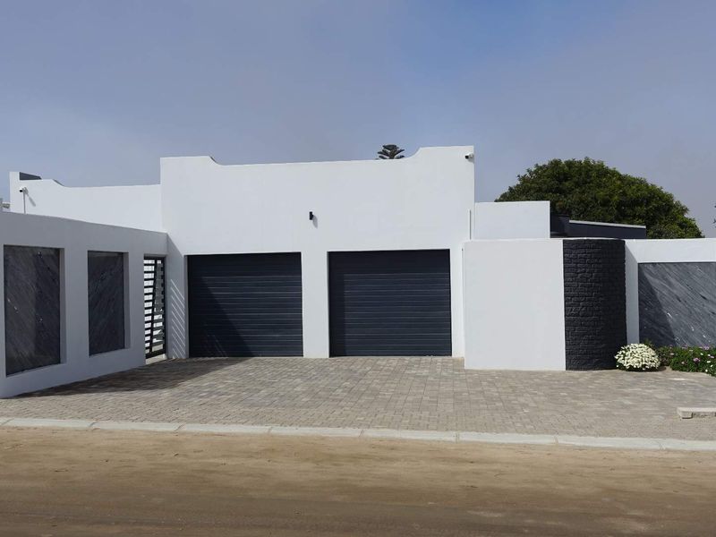 Seaside family lifestyle in Hage Heights, Swakopmund, with sweeping ocean views, indoor all-season BBQ, manicured garden and bonus two-bedroom flat — five-bed, five-bath, triple garage.