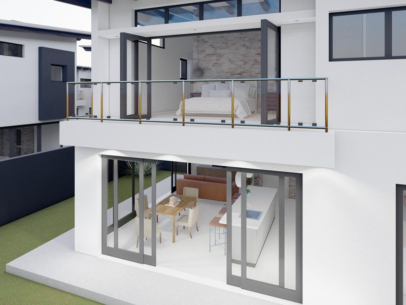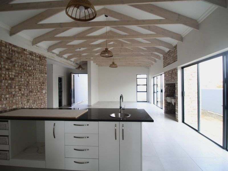 Contemporary home under construction in a leafy setting with open truss roof and inside braai, high-end finishes, study and open-plan living. Three beds, three baths, double garage; completion Oct 2025.