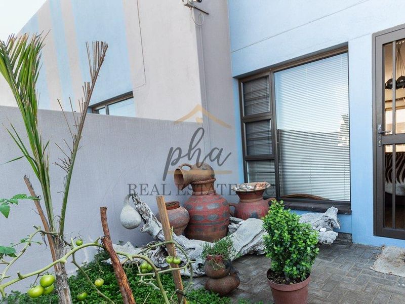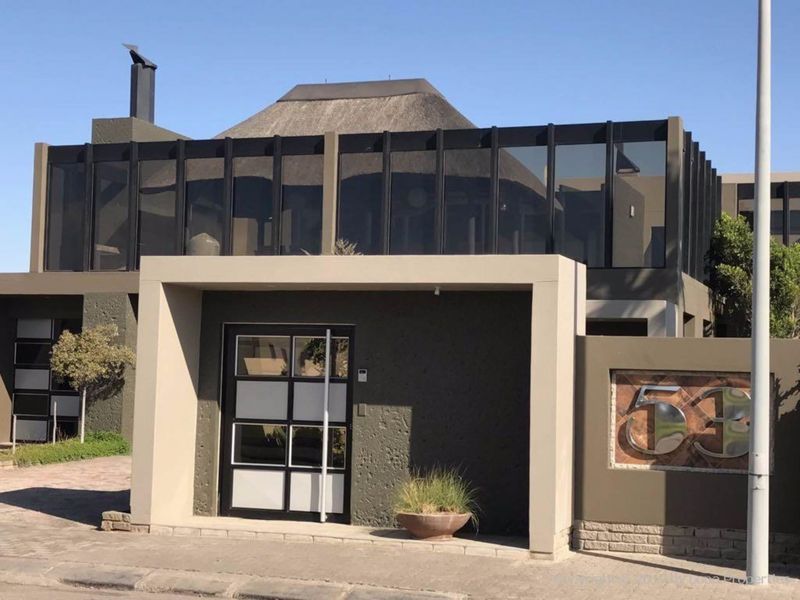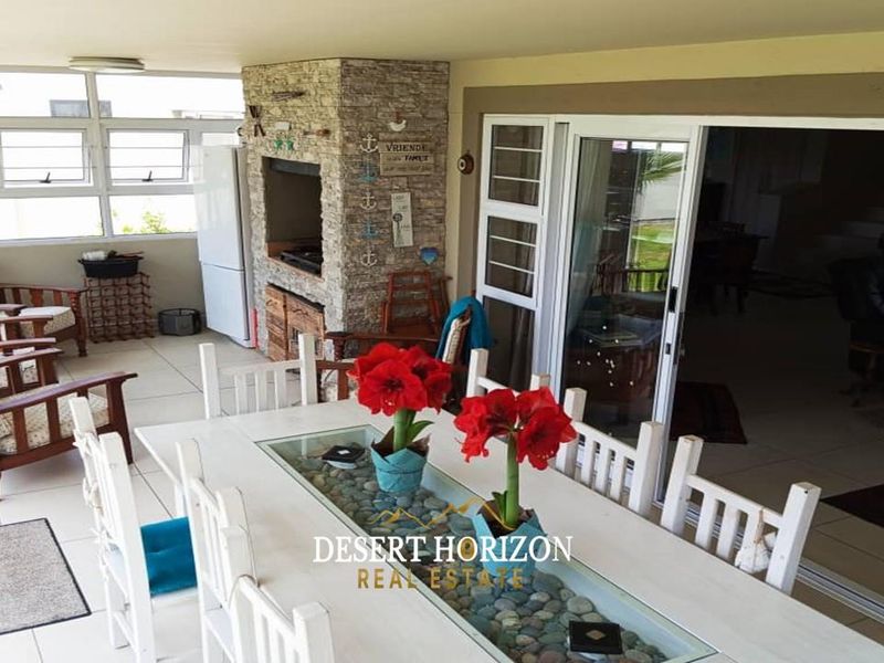 Relaxed coastal living in Kramersdorf, Swakopmund with a 200m² private garden and indoor BBQ entertainment space opening to green views, cozy fireplace, three bedrooms and four garages.
