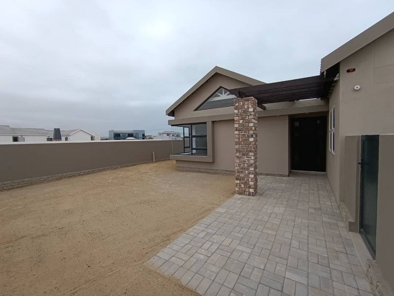 Coastal lifestyle in Swakopmund's Mile 4 Ext 1, Emerald Street — open-plan living with a wind-protected courtyard and built-in BBQ, three bedrooms, three bathrooms, triple garage.
