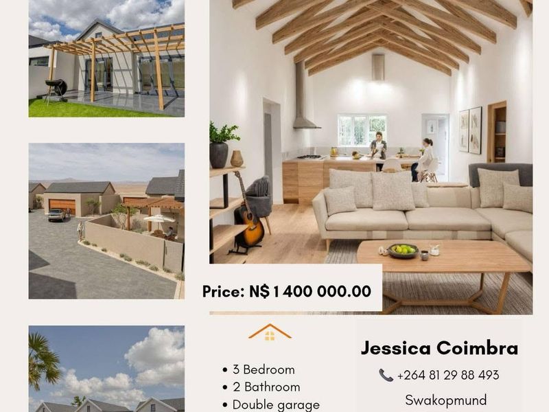 Enjoy community-focused living in Tamariskia, Swakopmund — minutes from the town centre and schools, with sunlit open-plan living and modern kitchen; three bedrooms, two baths, single garage.