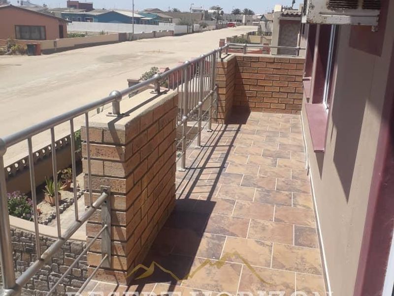 Coastal living in Tamariskia, Swakopmund with flexible living and rental income — entertainment room with indoor braai and upstairs flat with wooden deck. Five bedrooms, four bathrooms, tandem garage.