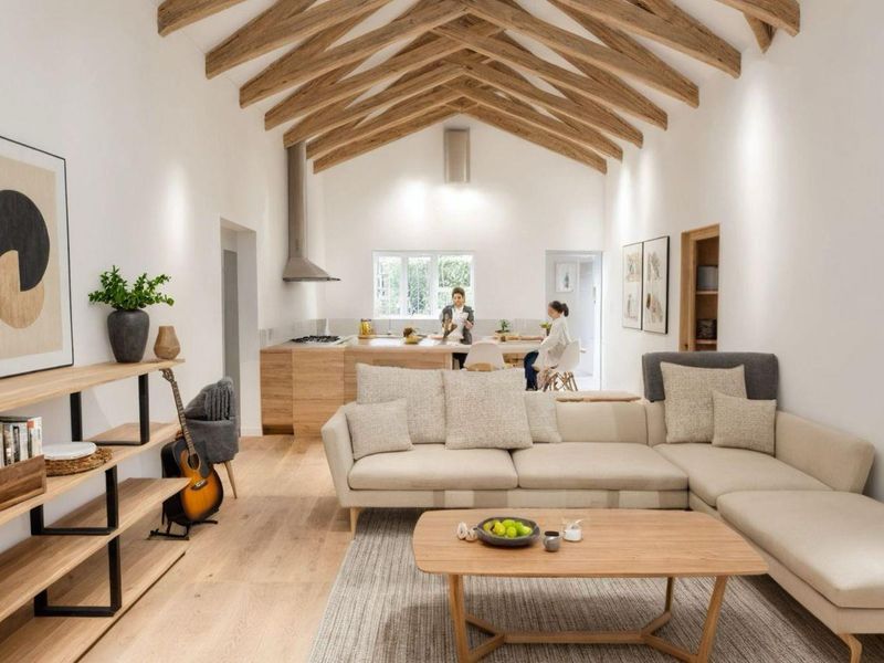 Brand-new gated estate offering private gardens and paved driveways, open-plan living with high vaulted ceilings and exposed wooden trusses, patio with pergola — three bedrooms, two bathrooms, double garage.