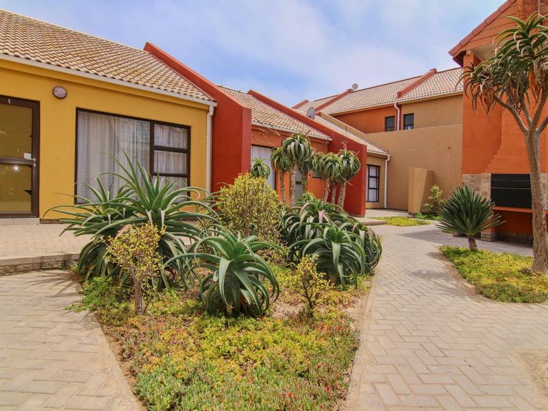 Garden-focused apartment block on Vrede Rede Street offers first-floor units overlooking a central garden and communal BBQ — 93 m², 2 bed/2 bath from N$935,000; garage extra.