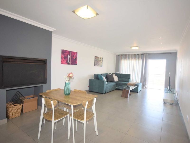 Double-story apartment with 3 bedrooms, open-plan living, indoor braai, garden, and 2 garages near the beach.