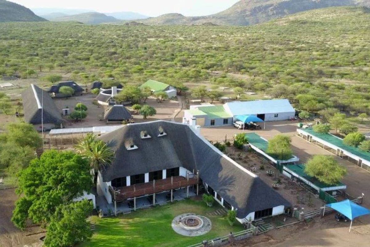 A registered hunting lodge with accommodation, main building, guest entertainment area, staff quarters, animals, vehicles, and power facilities.