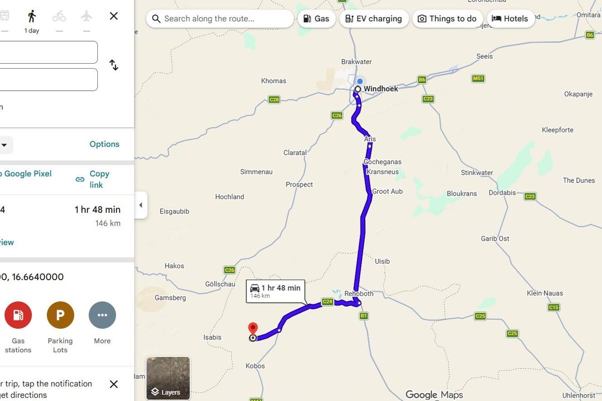 ±4 km from the B1 (Rehoboth–Kalkrand route)