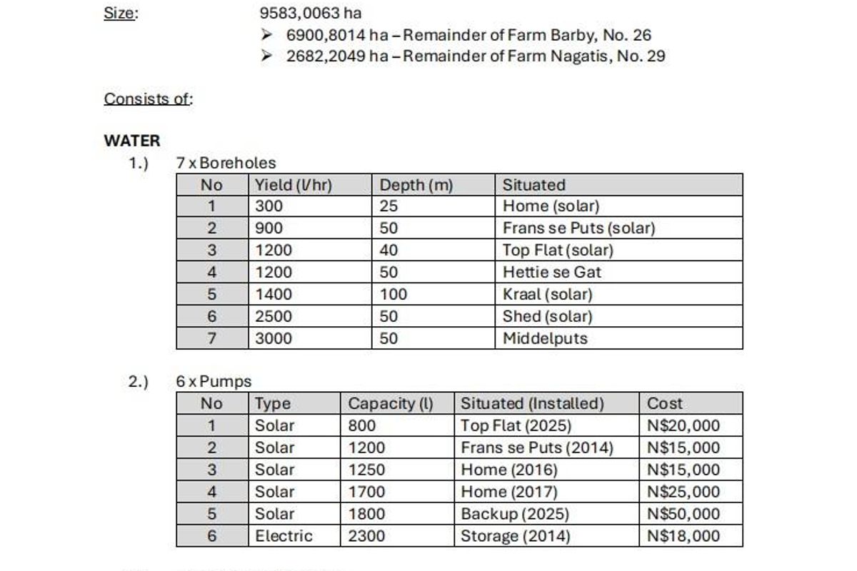 A rare opportunity to acquire a fully operational, large-scale farm combining cattle, sheep, and game farming with an established tourism and hospitality business — all in one of Namibia's most scenic and unspoiled districts. Spanning nearly 9,600 hectares across two registered titles, this is an incredibly well-watered, well-fenced, and comprehensively developed property ready to work from day one. With 34 rotational camps, 7 boreholes, extensive solar infrastructure, a 4-chalet guest lodge, campsites, a full bar and dining facility, and free-ranging game, this is a true multi-income producing farm.