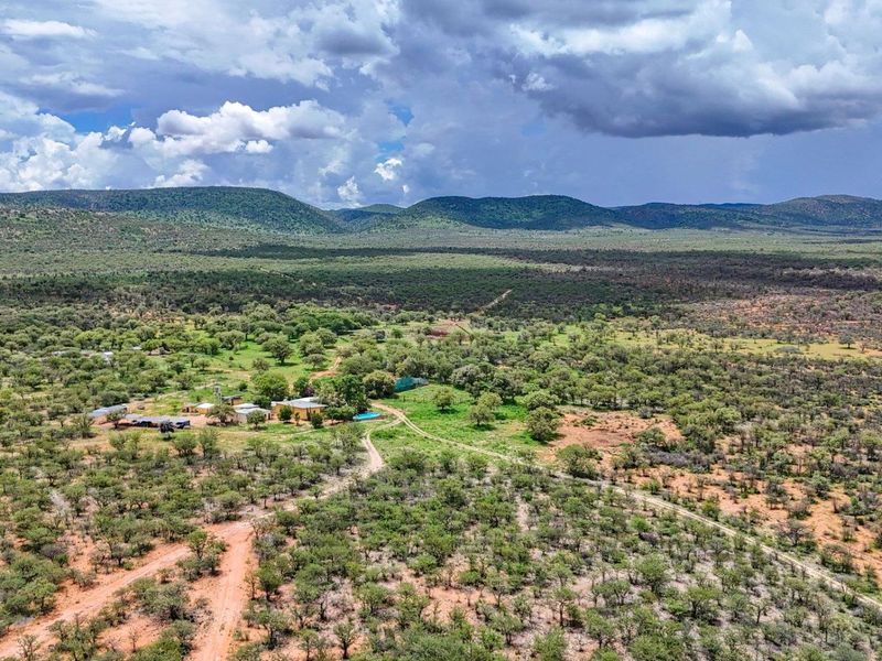 Off-grid farm living near Outjo, surrounded by table mountains and abundant wildlife; ideal for mixed farming and game ranching, with a 1.5ha underground-irrigated vegetable pad, pool and six bedrooms.