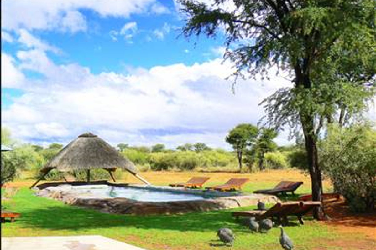 Private game retreat east of Windhoek near Hosea Kutako Airport — 255 ha of fenced farmland with chalets, tented camps, pools and roaming giraffe, oryx and kudu.