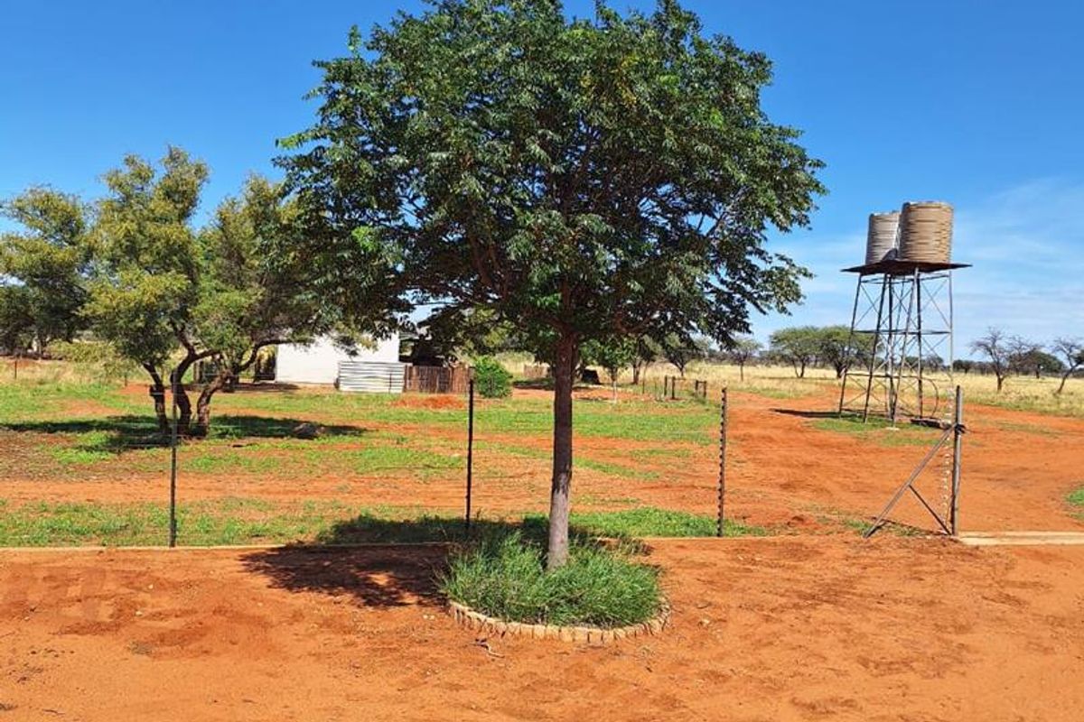 The land features sand and lime ground, supporting diverse grazing types such as Buffalo Grass, Blackfooted Brachiaria, Bushmen Grass, Schmidtia Grass, Meerjarige Beesgras, Anthephora, Rosyntjiebos, Wag-'n-Bietjie, Kampferbusch, Shepherd’s Tree, Camel Thorn, and Acacia.