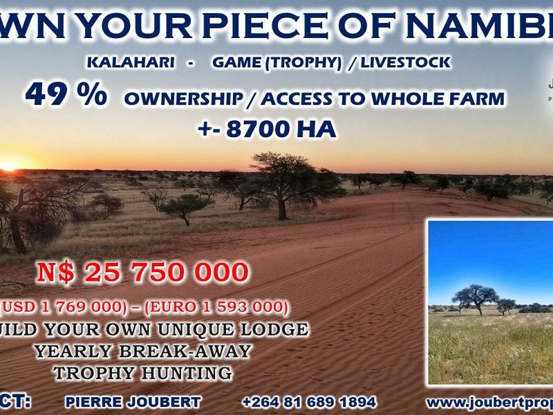 Escape to Kalahari wide-open living near Mariental, Namibia — 8,700ha of grasslands and dunes, game-fenced camps with abundant wildlife and 22 water points.