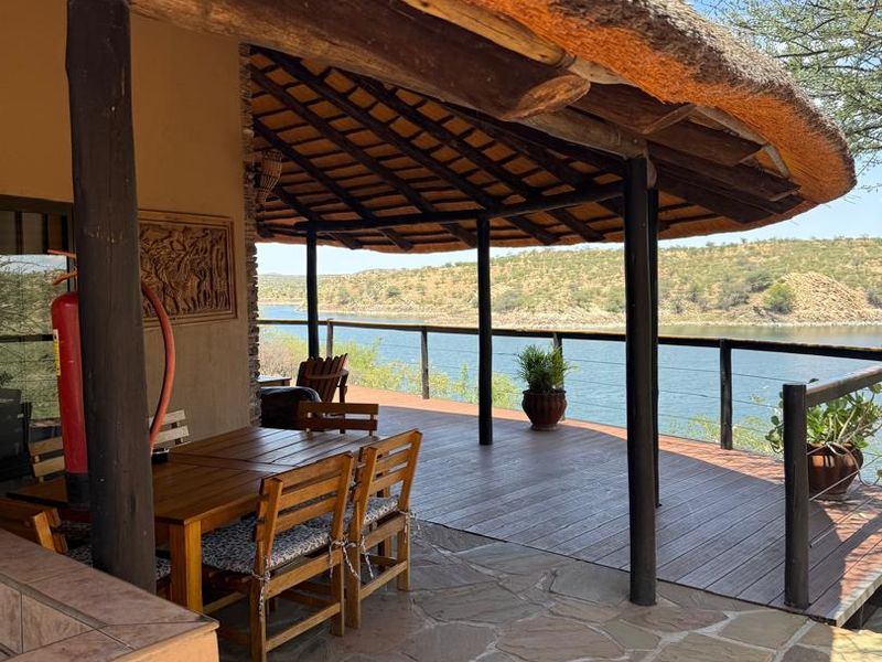 Relax in lakeside family living at Oanob Dam Resort with 180-degree water views, boathouse and outdoor braai — wildlife on your doorstep; three bedrooms, three bathrooms.