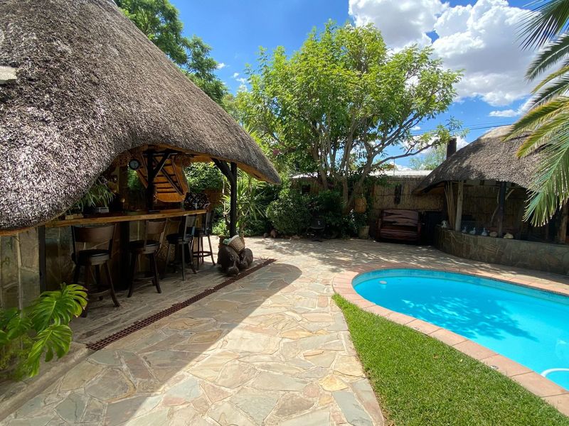 Experience hospitality living in Suiderhof, turnkey fully furnished guesthouse with pre-bookings, landscaped garden and pool, thatched lapa breakfast area and multiple en-suite rooms.