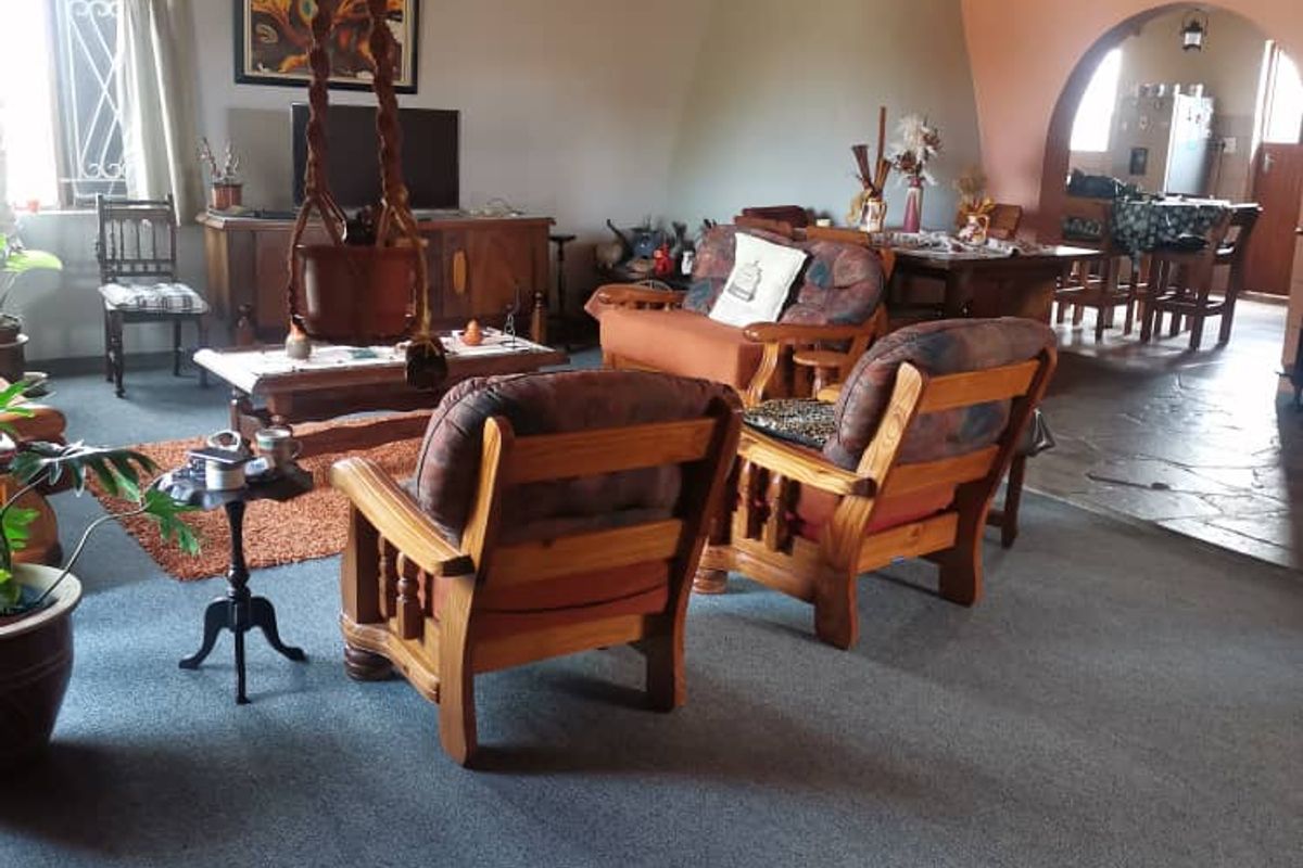 At the heart of the home is a huge living room that seamlessly flows into an open-plan kitchen. The kitchen is equipped with built-in cupboards, providing ample storage space, while the adjacent scullery ensures ease in meal preparation. The dining area is perfectly positioned to host family dinners or entertain guests.