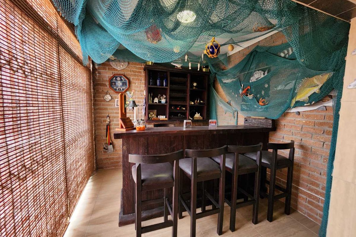 The expansive living area is designed for both relaxation and entertainment. It includes a dining area, a lounge/TV room, and features an indoor BBQ and bar, perfect for hosting gatherings. The kitchen is a chef's delight, equipped with granite countertops, a breakfast nook, and a pantry, ensuring ample storage and preparation space.
