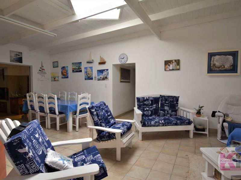 Beachside family retreat in Henties Bay Ext 6 — relaxed coastal living with sunlit open-plan lounge and inside braai area. Four bedrooms, three bathrooms and four garages.