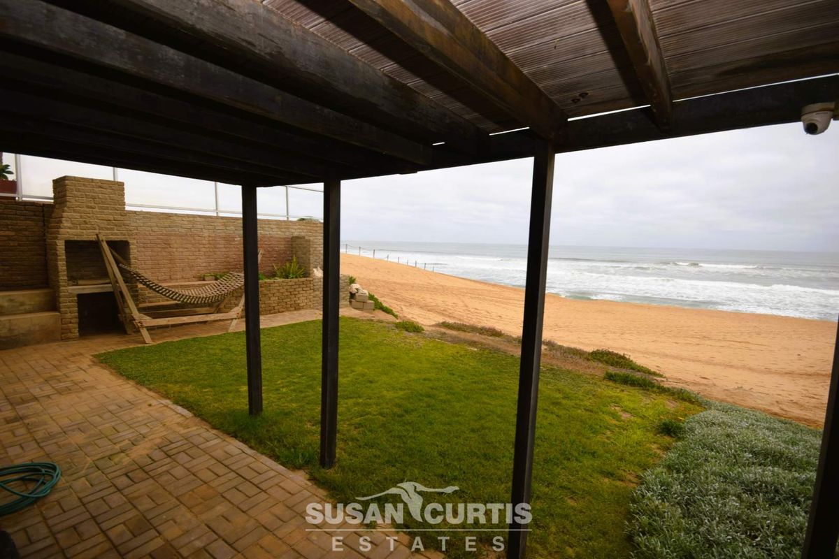 Enjoy panoramic sea views from living areas and three bedrooms in Noord Duin, Henties Bay; corner beachfront unit with private entrance, built-in braai entertainment area and triple garage.