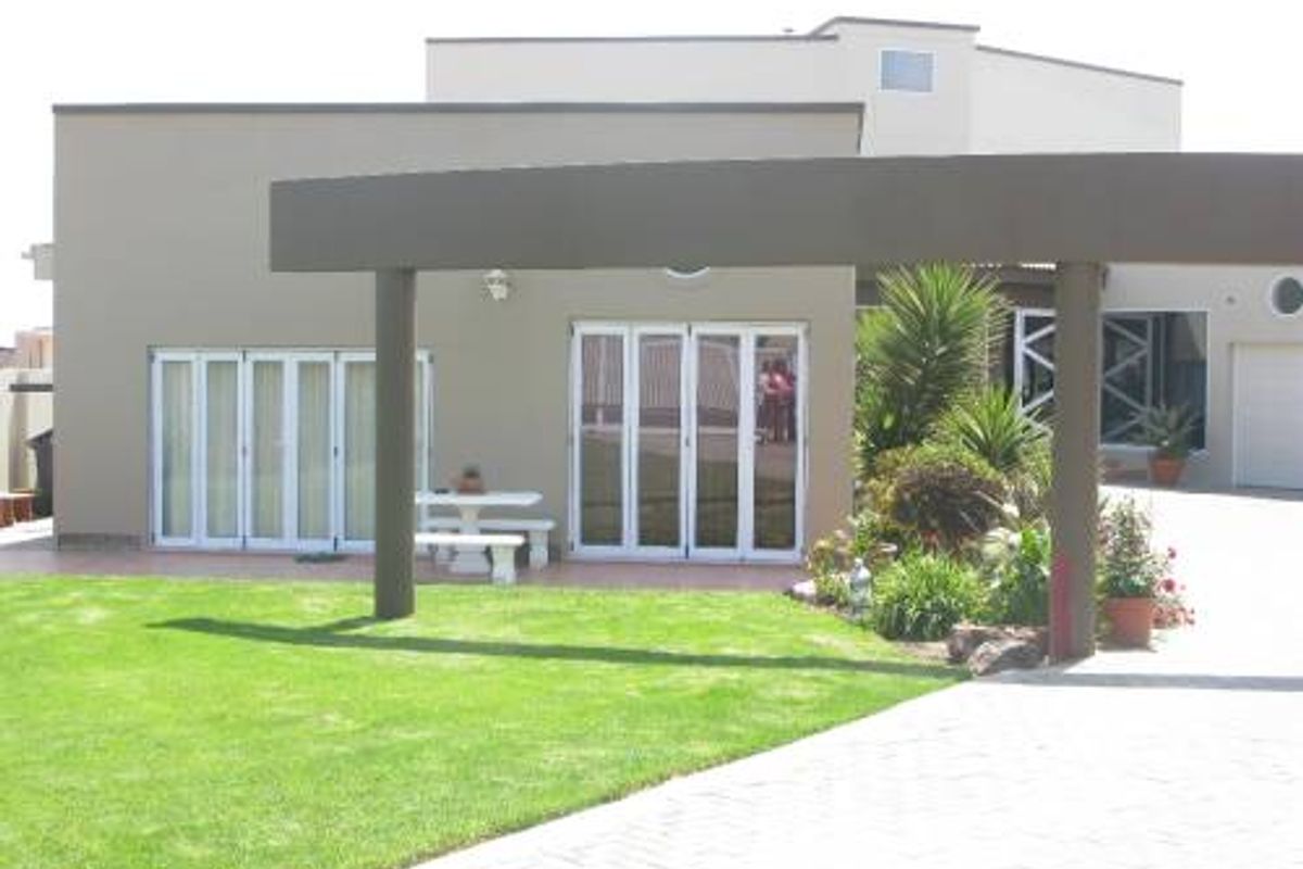 Seaside family lifestyle in Hage Heights, Swakopmund, with sweeping ocean views, indoor all-season BBQ, manicured garden and bonus two-bedroom flat — five-bed, five-bath, triple garage.