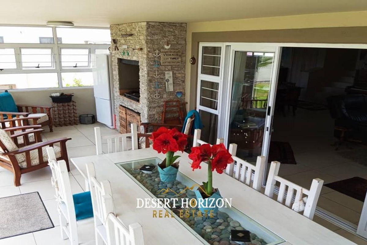 Relaxed coastal living in Kramersdorf, Swakopmund with a 200m² private garden and indoor BBQ entertainment space opening to green views, cozy fireplace, three bedrooms and four garages.