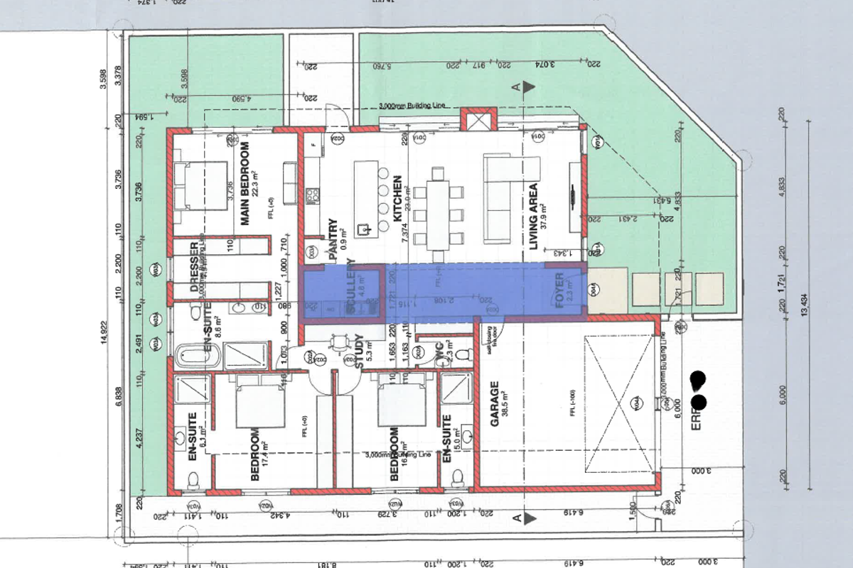 Contemporary home under construction in a leafy setting with open truss roof and inside braai, high-end finishes, study and open-plan living. Three beds, three baths, double garage; completion Oct 2025.
