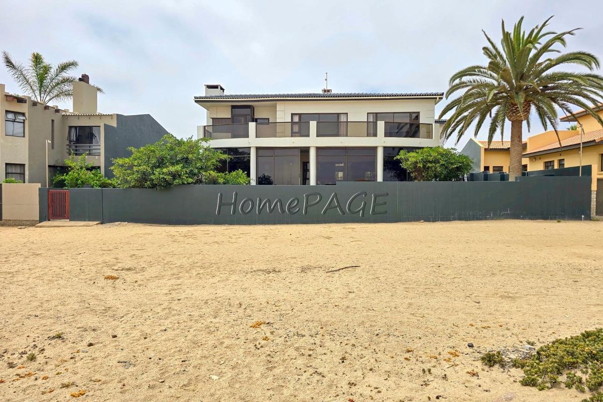 Entertainer's haven with permanent dune and Swakop River views, expansive balcony, mature palm gardens and fire pit — four en-suite bedrooms and two double garages.