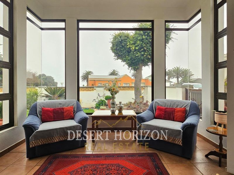 Relaxed coastal living in Extension 9, Swakopmund — quiet cul-de-sac, northwest sunset balcony atop garages, indoor braai entertainment room, and separate two-bedroom flat.