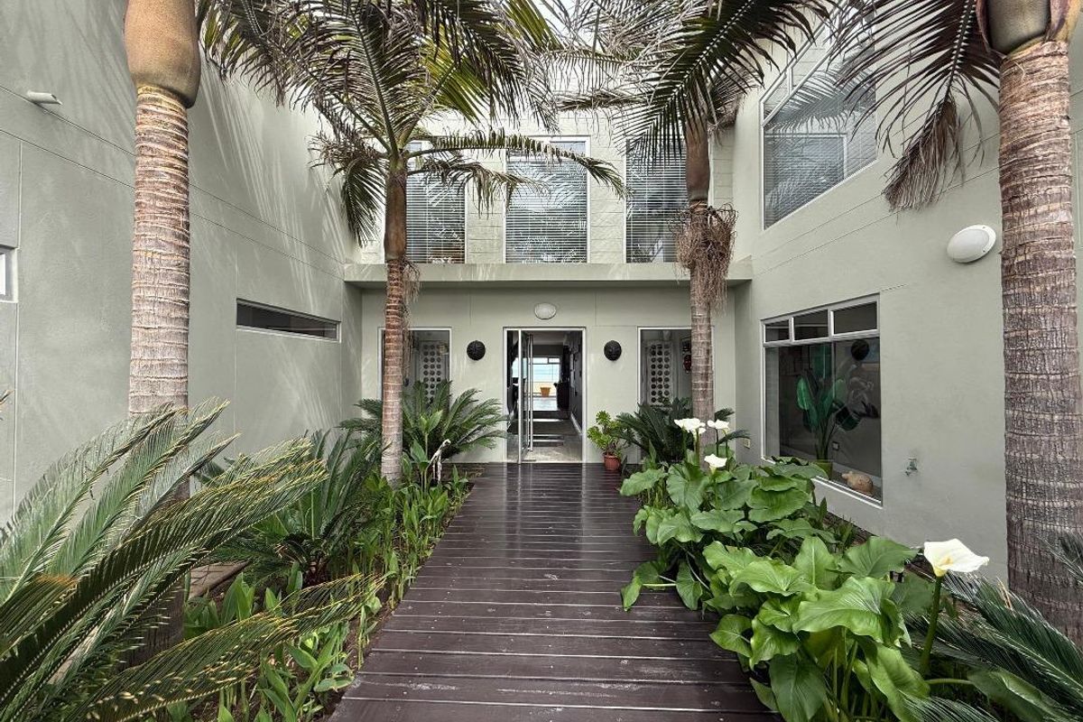 Overlooking the beach, this elevated triple‑storey retreat offers panoramic sea views and a private rooftop — perfect for entertaining with indoor/outdoor braai, sunken patio; five bedrooms.