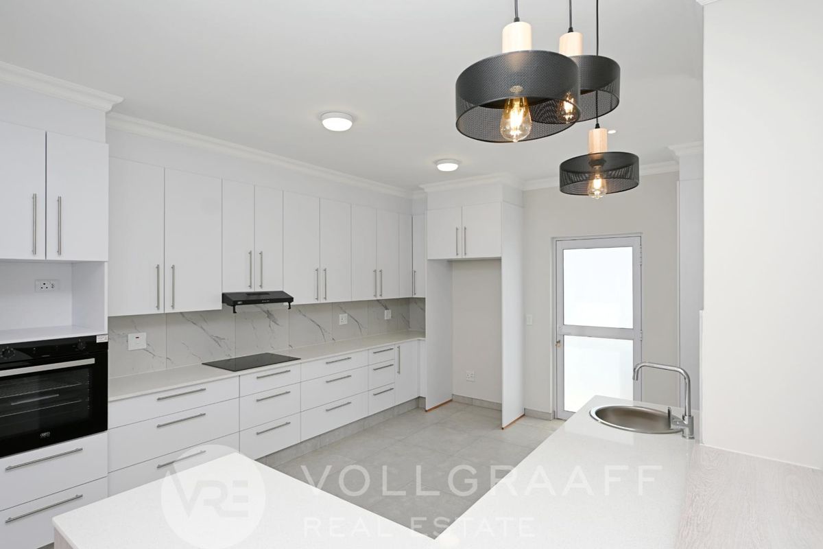 The open-plan kitchen is practical and stylish, featuring ample cupboard space and a scullery space to keep the main kitchen neat and organised.