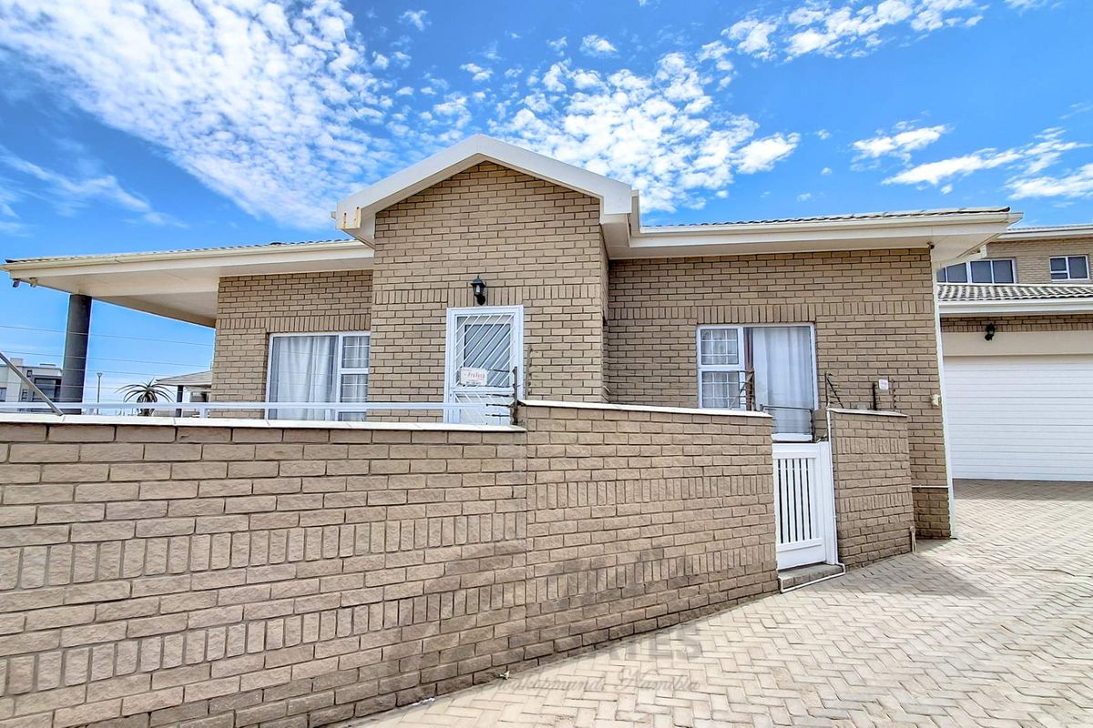Beachside lock-up-and-go living just steps from the sand, with spacious open-plan living, large private courtyard and veranda with braai — three beds, two baths, double garage.