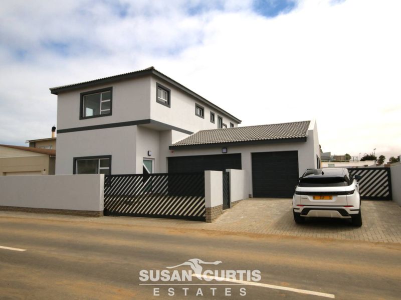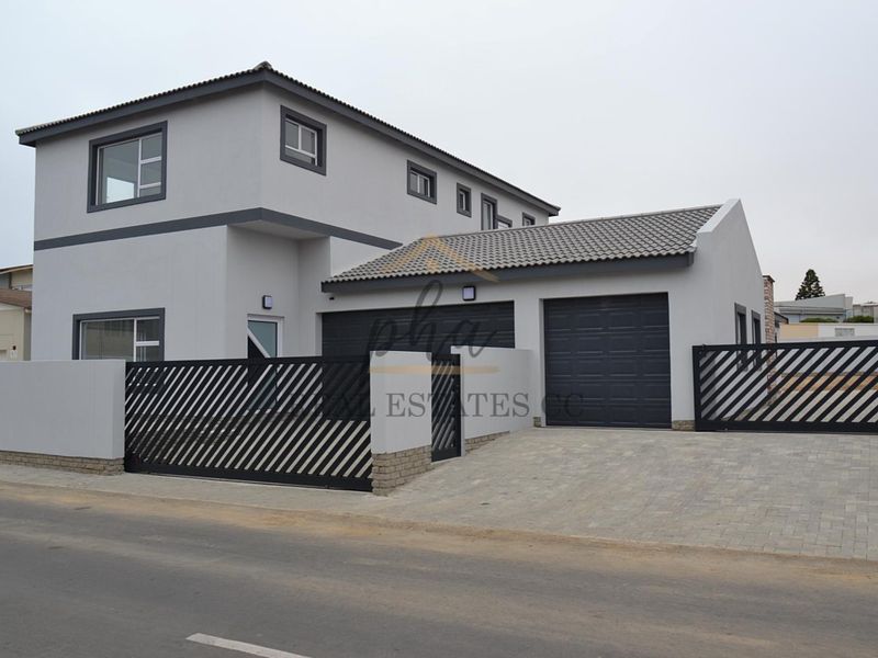 Beachside family living on Swakopmund's waterfront — walk to the sea and shops. Airy open-plan living with high ceilings and scullery; four bedrooms, four baths, three garages.
