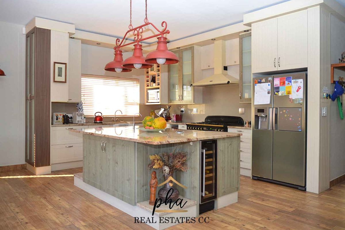 Lovely open kitchen well equipped, beautiful granite tops and gas stove. Scullery that leads to the 3 garages, two for the motor vehicles and one for the tools and machinery.