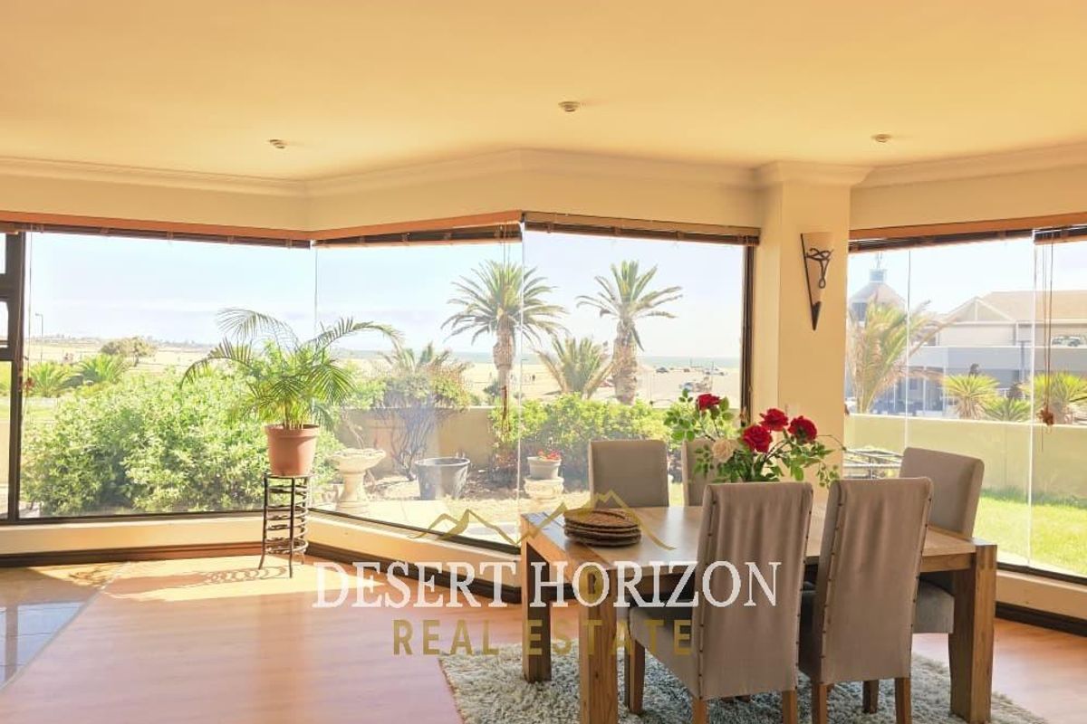 Relaxed coastal entertaining on Swakopmund Waterfront with panoramic sea views; five bedrooms, five bathrooms and double garage — ideal for family living or Airbnb potential.
