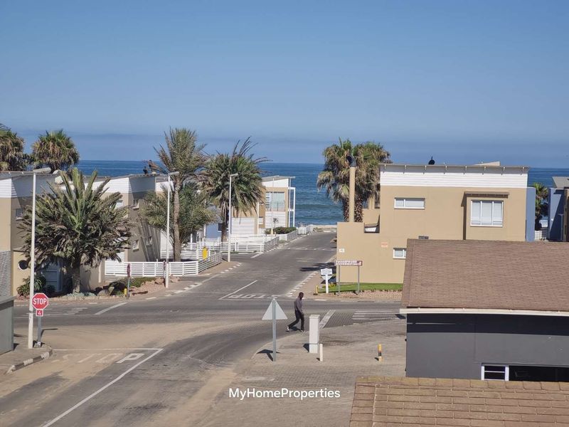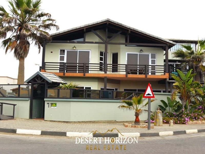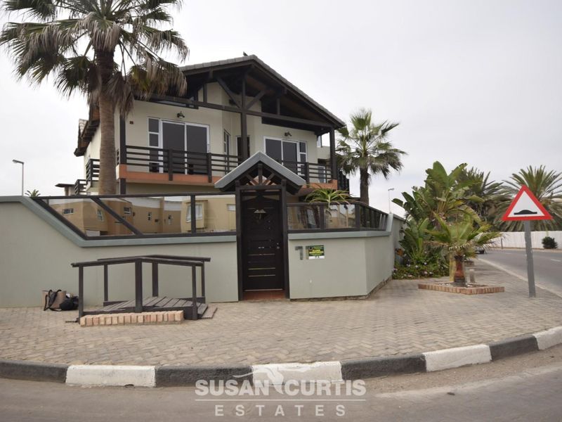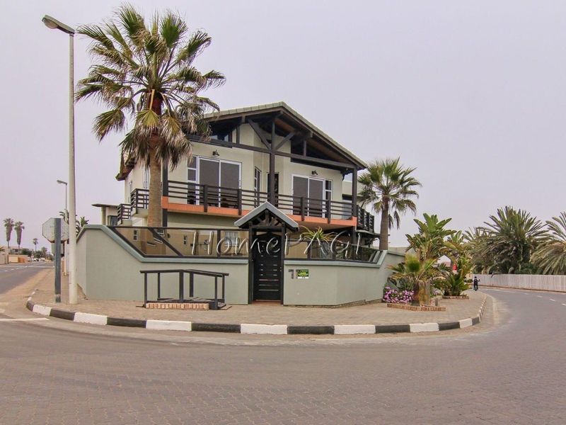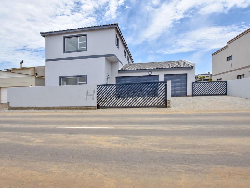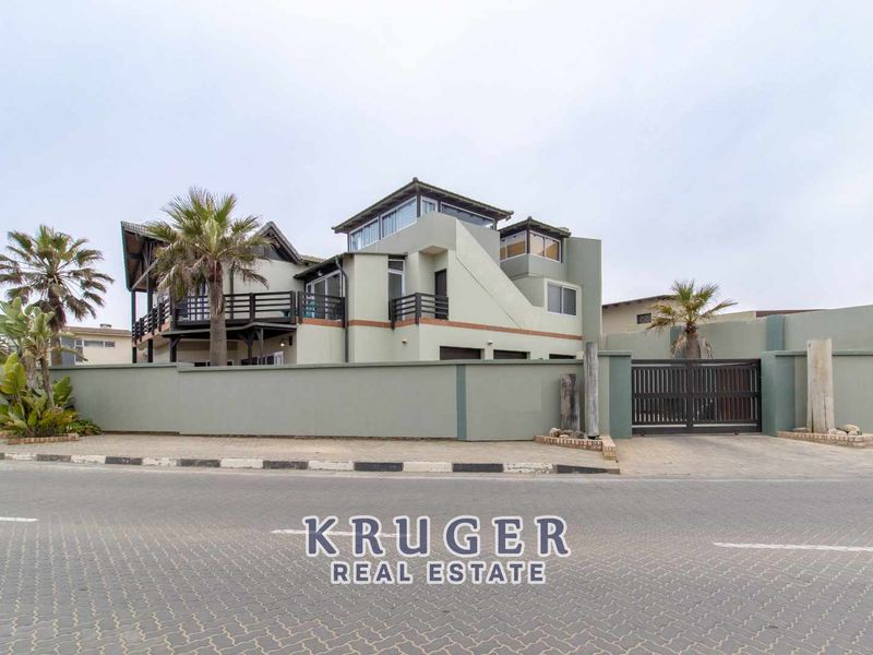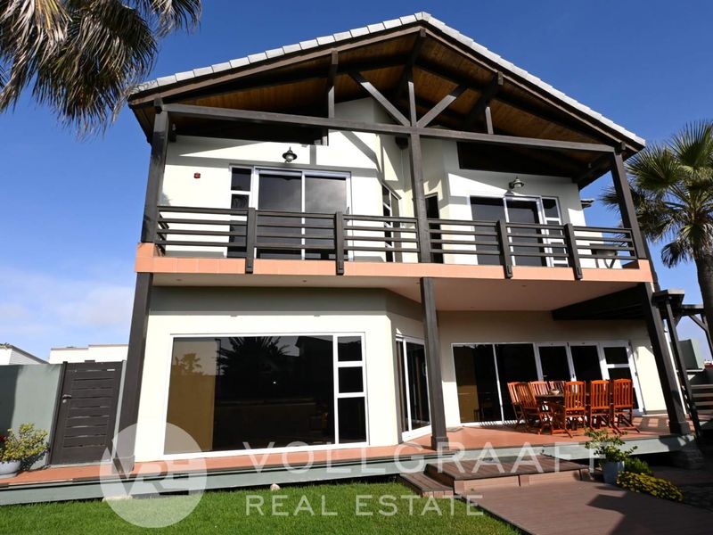 Waterfront Swakopmund lifestyle with panoramic sea views and entertaining rooftop bar/BBQ. Gourmet kitchen with Falcon stove, indoor braai, four bedrooms, four baths and three-car garage.