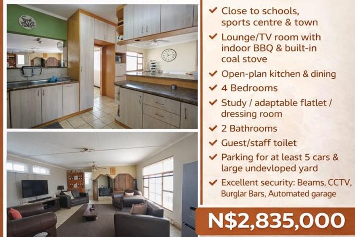 Family-focused central living in Walvis Bay, steps from schools, sports centre and town; home features indoor BBQ/coal stove, large yard potential and four bedrooms, two baths.