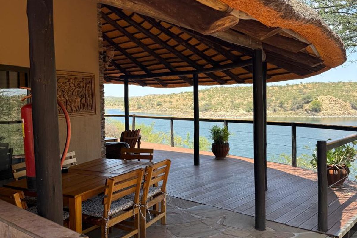 Relax in lakeside family living at Oanob Dam Resort with 180-degree water views, boathouse and outdoor braai — wildlife on your doorstep; three bedrooms, three bathrooms.