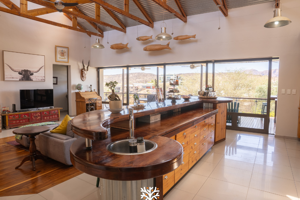 Discover this extraordinary, bespoke home nestled on a sprawling mountainside erf of 2,429 sqm in the scenic Auasblick. A true masterpiece of craftsmanship and luxury, this residence seamlessly blends nature with modern comfort, offering an unparalleled living experience.