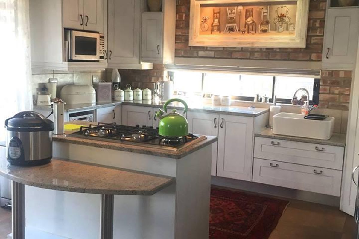 The house consist of 3 bedrooms, 3,5 bathrooms with a separate 2 bedroom flat with own entrance and shaded parking with small garden. Kitchen with scullery/pantry and dining nook. Open plan dining/living room with fire place and indoor BBQ, with TV room and bar, opening on covered pation with heated pool and spacious garden. The main bedroom has a walk-in closet, study and sunroom/gym. Three garages with extra parking, ample security and near amenities.