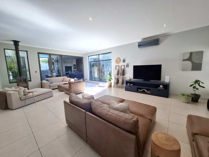 Resort-style living on a generous 1,077 m² erf in a peaceful residential enclave, with pool and deck, expansive entertainment area, five en-suite bedrooms and three-car garage.