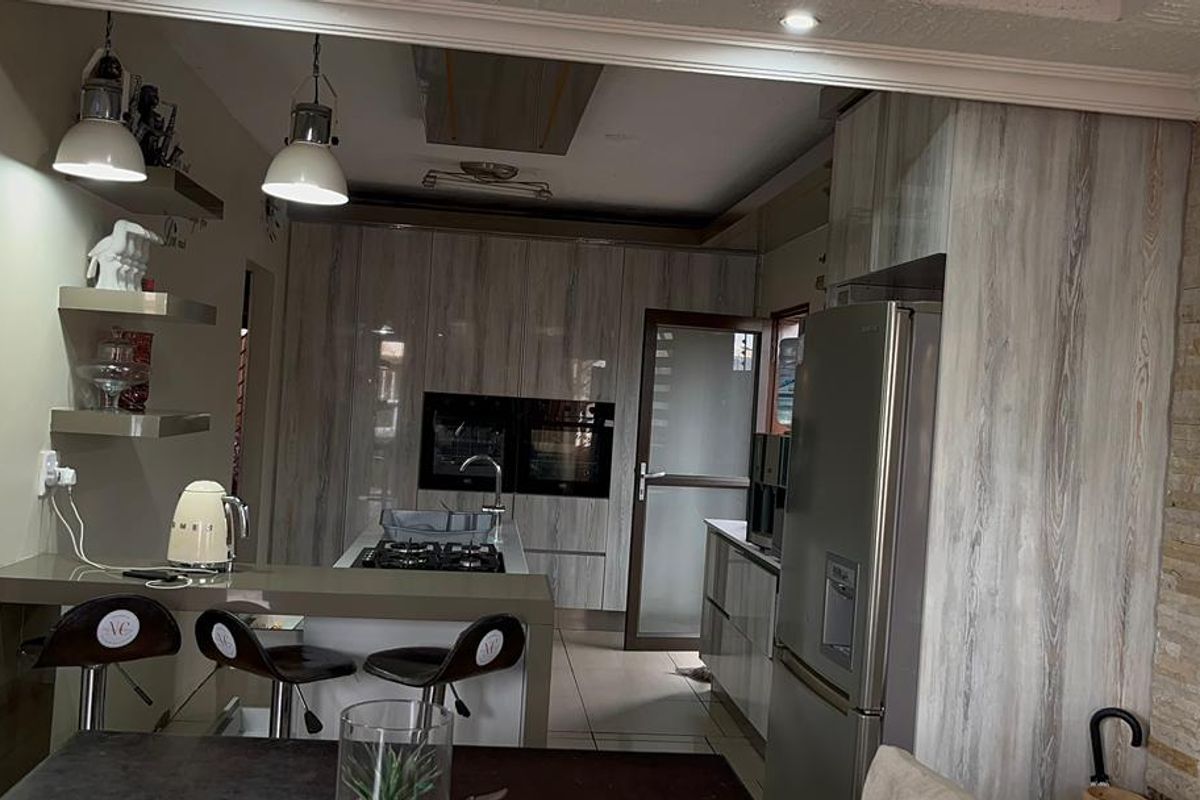 Entertainers' dream in a leafy, family-friendly neighbourhood — spacious lounge, kitchen with gas stove and covered entertainment area with built-in braai and bar; five bedrooms, three bathrooms, three-car garage.