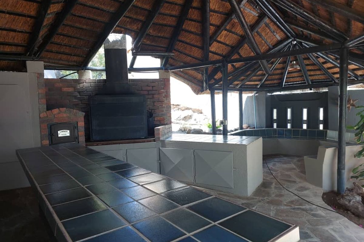 Family entertainer's paradise in a peaceful setting on a huge erf — low-maintenance garden, sparkling pool and lapa with built-in BBQ and pizza oven. Three bedrooms, two baths, double garage.